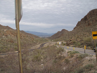 Parts of the next few miles I recongized from the Mt Lemmon ride in November. The next 20 miles or so were windy, but had lots of rollers and a very fun downhill on Tangerine. We then crossed underneth I-10 and turned onto Silverbell. This was the worst of the wind for the day with a combination of a headwind and some not-so-happy pavement. We went up a short hill called Rattlesnake Pass and joked about the fact that photographers on rides always wait to take picture of cyclists after they have spent hours ascending a pass and, bluntly, look like hell. I had a flat just before Gates Pass; Alan graciously helped me change it. More joking about his Yin (bad wires) and my Yang (bad tires). Then we ascended Gates Pass which is about 2 miles of fairly steep climbing (not the worst, but probably has some short segments into the 8-10% range). At the top, Alan texted his wife and I took some pictures; the view was spectacular Then a screaming, twisting descent down to the last manned control in the wind.