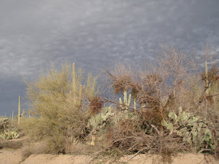 Even though the weather was supposed to have an ascending chance of rain at this point, the sun came out for the first time in hours and we got a real treat of a tailwind/descent on Sandario. I took some more pictures as we easily spun at about 25 mph. It's impressive when you ride at 25-30 mph and still don't feel any wind. We turned briefly on Marana Road and discovered just how powerful the wind was; as a crosswind, it nearly blew me over. We stopped at the Circle K for a bit of water and I put on a dust mask; I have mild asthma and I remembered the plumes of dust that were likely all around us. That turned out to really be a good move for me. Coughing with a chest contusion is exceedingly painful.