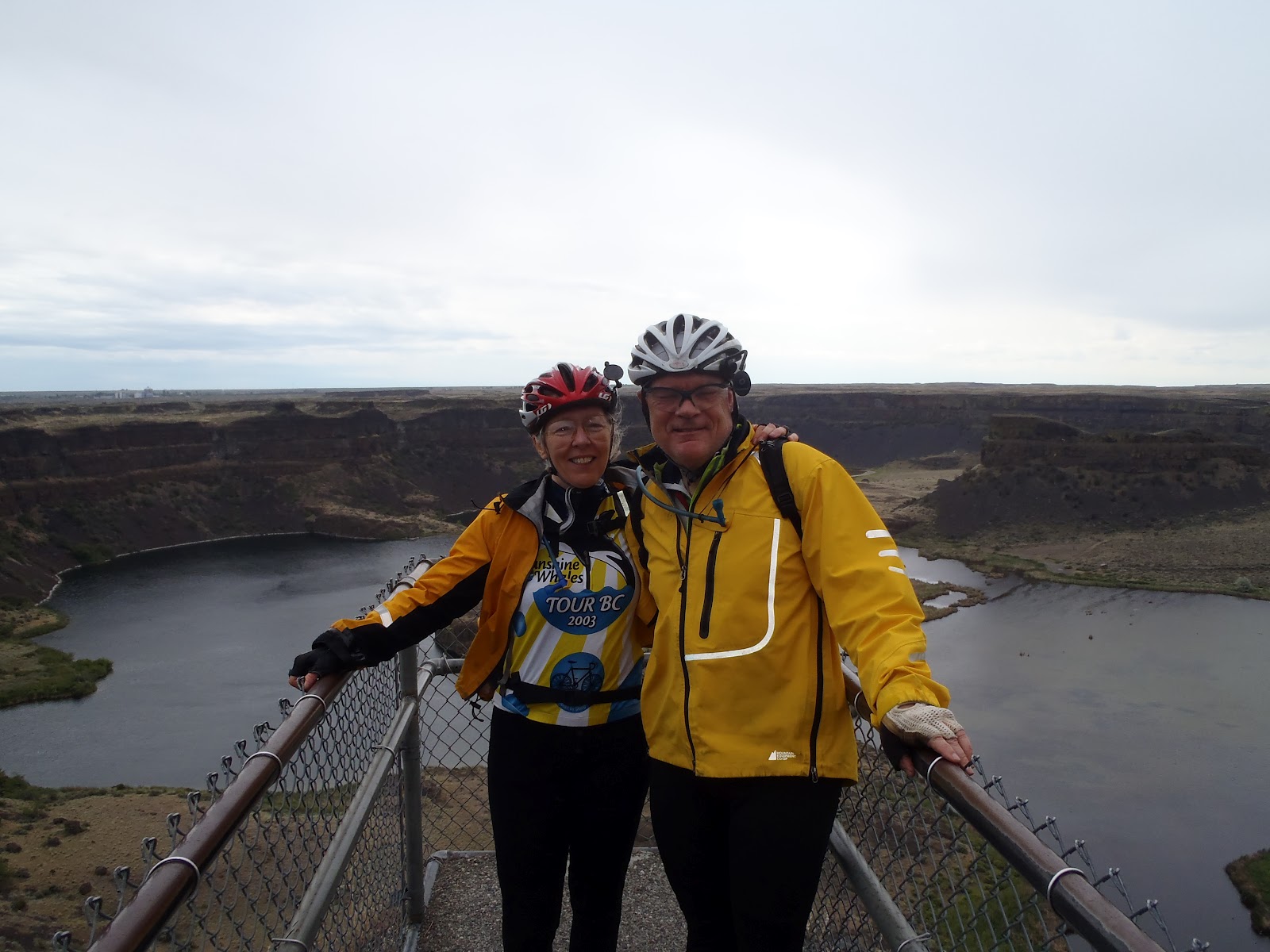 At Ephrata, I filled my camelback since it was a quite a haul. We put more rain gear on as the rain started in harder. The forecast had been for 82, it was about 52. The next few miles turned directly into the wind and Ron did most of the pulling in what I can only way was supremely impressive. As we passed Soap Lake, we gained a line of riders behind us. Big rollers along this valley in the wind really busted some people up. I have ridden in so much wind it didn't phase me and I easily kept up with Ron. But I decided to climb a little slower as we approached the big climb to Dry Falls. This day just wasn't my climbing day, I thought. My chest continued to be a little tight.