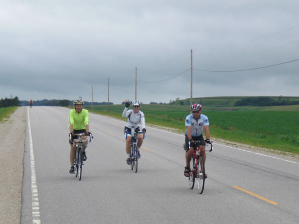 There is a long climb out of Decorah and it goes slowly. I continue to climb slowly and the other's lights disappearing up the hill makes it seem a little more lonely. Paul goes ahead, but Bob hangs back. Ralph is getting tired and having stomach problems. It is the dead of night and I find myself sleepy. I take a caffeine pill to stay up. That makes my stomach not so happy as well. Our pace gets much slower.