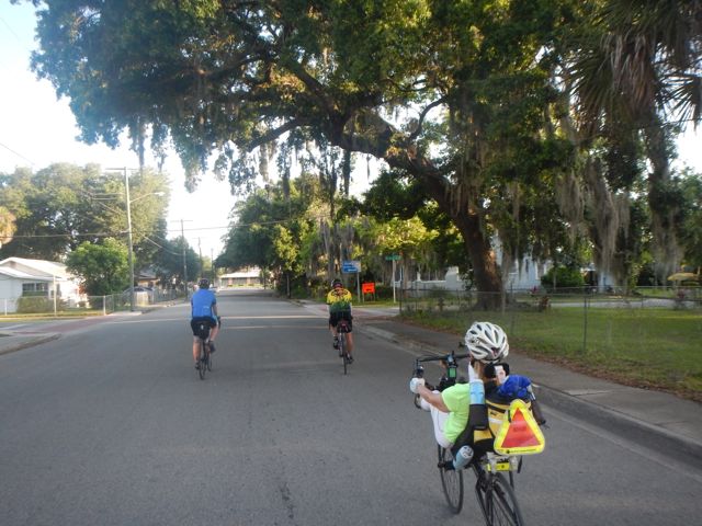 We will have a tailwind all day as we head east to Lake Wales. It’s a bit drier inland -that makes the shade feel good. But temperatures are going up quickly and we know it will be a scorcher. Marti is elated at having finally oiled the derailleur in the right place and her drive train is nearly silent.
