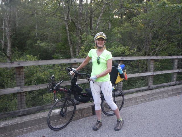 The day is half done and we are happily pedaling along when I hear a horrible crunching sound behind me. Vickie caught a wheel on bad pavement and went down. At least 3 cars stop to help. She is fine, picks herself up, fixes her bike and we roll without ado. I’m impressed! In case you were wondering, she also has better thighs than me.