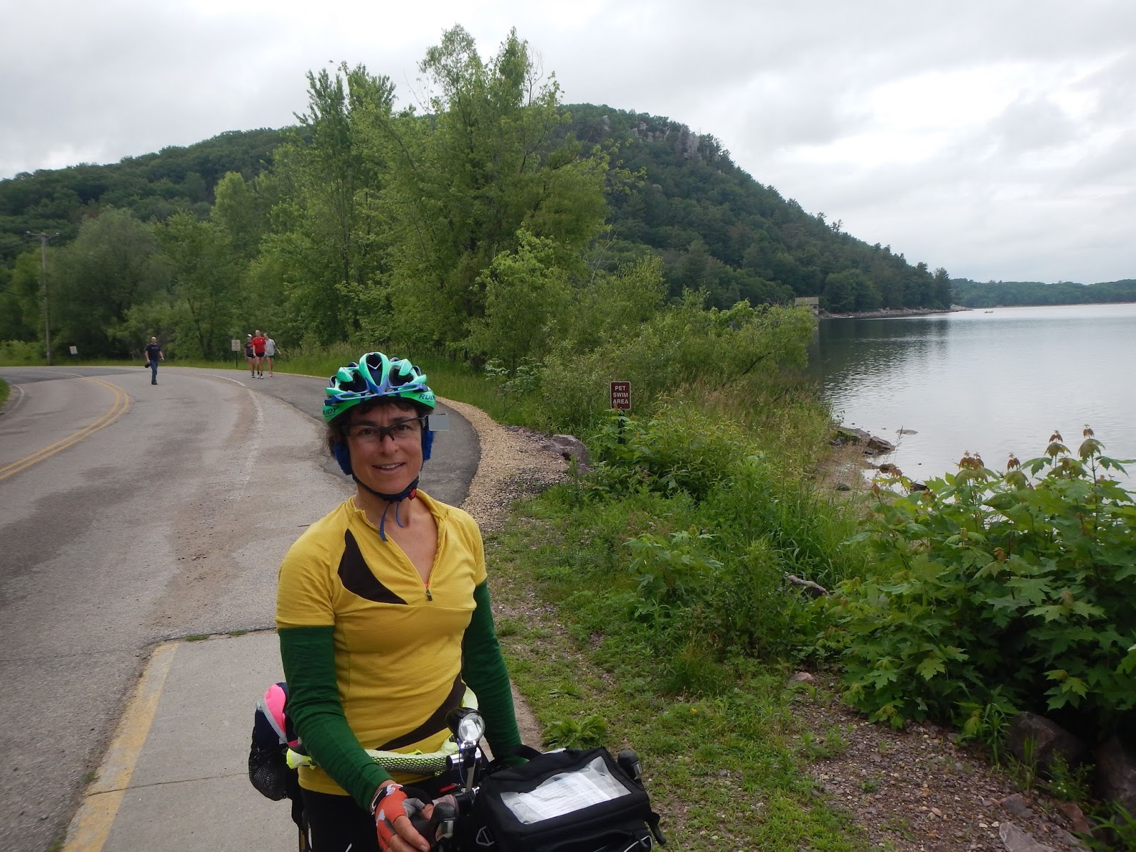 The section just before Lake Mills is marked by large, plop-like glacial features called drumlins. Just as we arrived, the first major plops of rain arrived on cue. I stopped and rolled down my rain legs, grabbing my rain jacket and just getting it zipped as the sky opened and absolutely poured! I haven’t been in rain like that since the Gold Rush. Gee what a great friend I was for dragging my friend out into the path of the Kraken. Fortunately, she had new rain legs. Putting on rain pants would have been a project on the road and we had so little time before the deluge she’d have been soaked to the bone before they were on. Love rain legs, so easy to deploy….