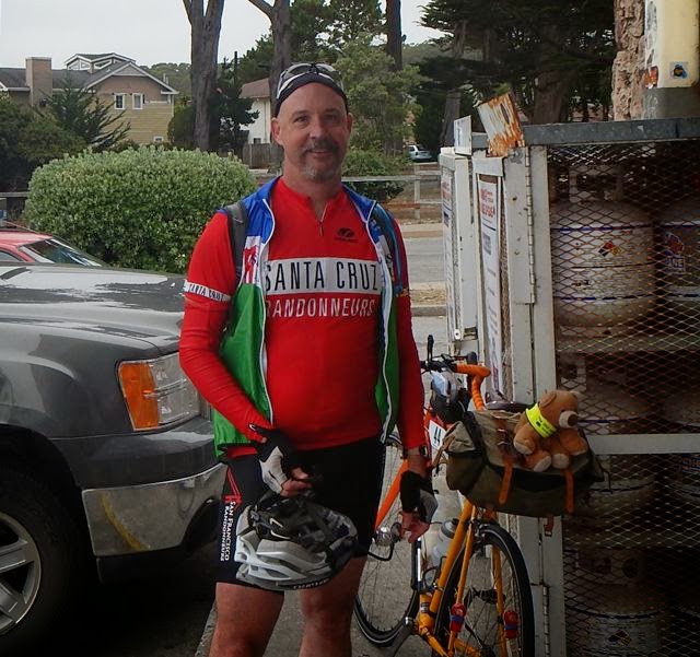 We turned inland again for some climbing and descents into various hollows (at least that is what they call them in Ohio, where I am originally from). Very pretty and I hooked up with Chris from California who had also ridden the Cascades. We turned out to have ridden with some of the same people on various rides. I also met Don from San Francisco and his pet bear (I admit my goat at home should probably have come on the ride). The three of us along with Alex powered in to El Grenada on Hwy 1 with no problem. The control was bustling, especially for a really odd convenience store that has very little food. I grabbed a Naked, a big pastry, filled bottles and cleared out pretty fast. But I did get a nice shot of Don.